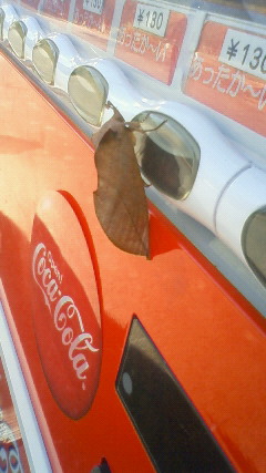 木の葉のように見えるのは擬態している虫です。アカエグリバ? 肉眼で見るのは初めてでした。しかも自動販売機に!